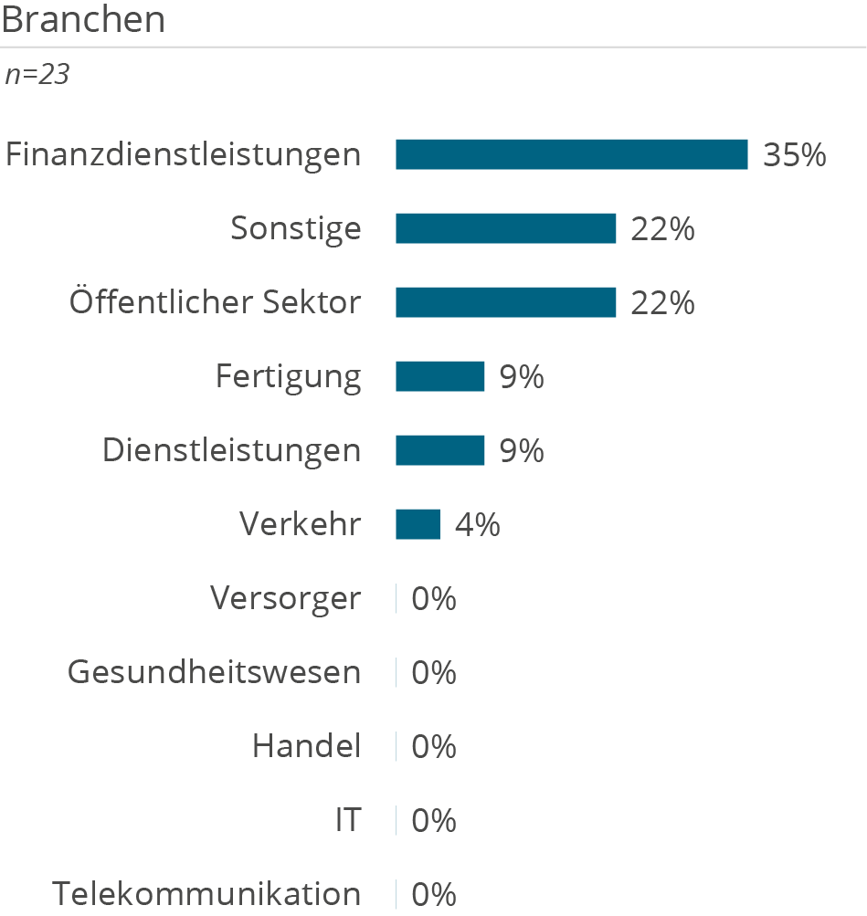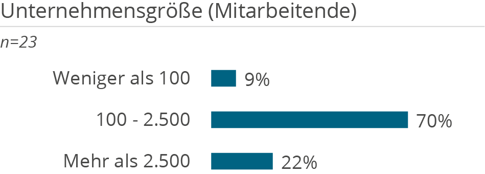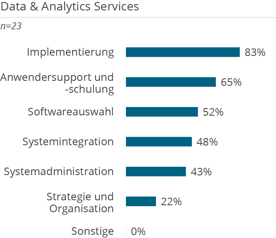 Die folgenden Demografie-Grafiken zeigen neben Kundendemografie (Unternehmensgröße und Branche), die Unterstützung der Kunden aufgeteilt nach Tätigkeiten in D&A Themenbereichen, erbrachten Services sowie eingesetzten Technologien.