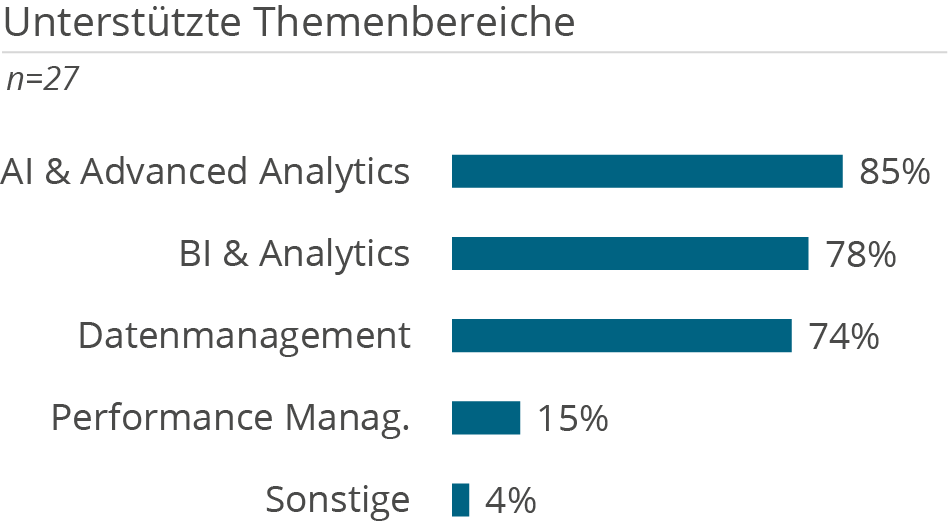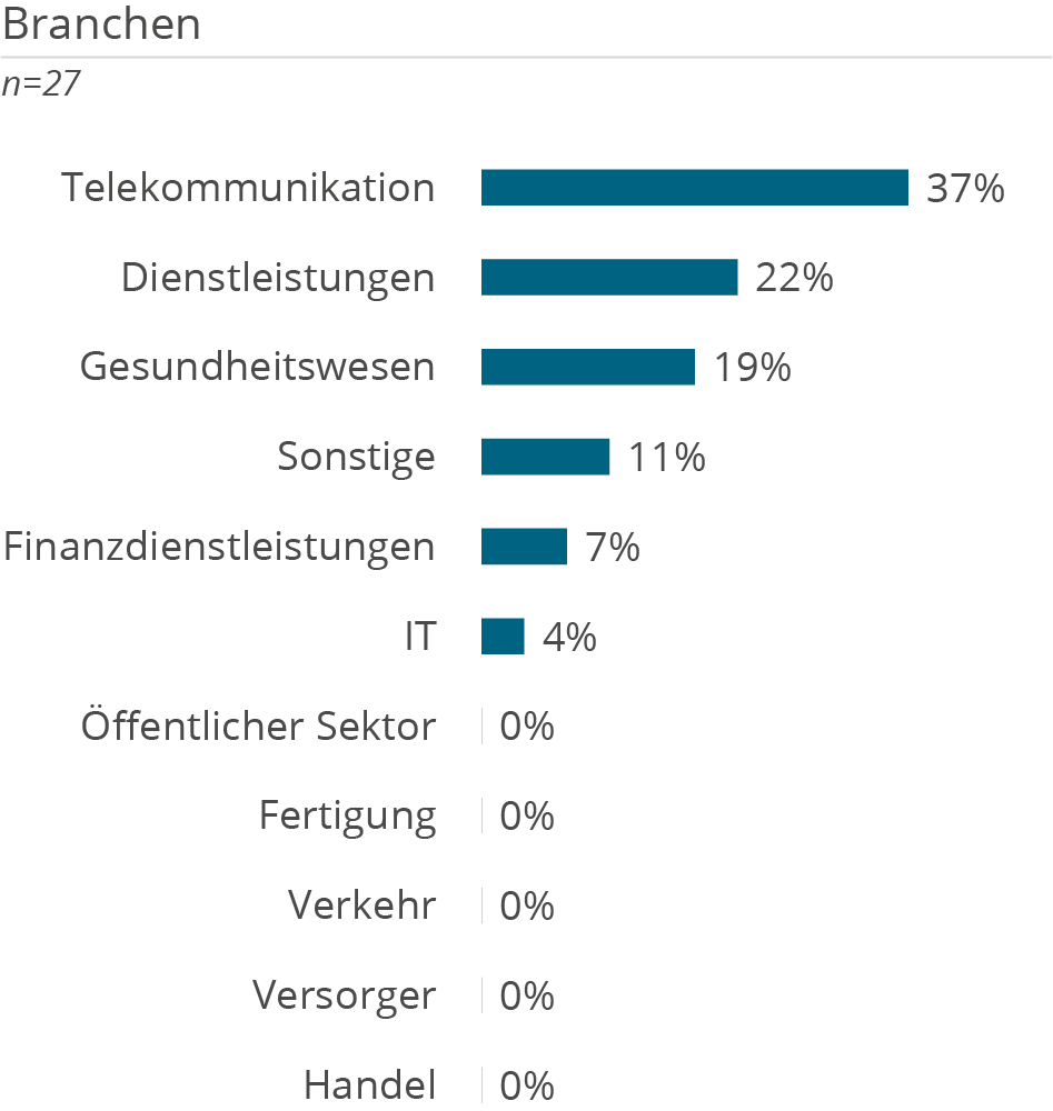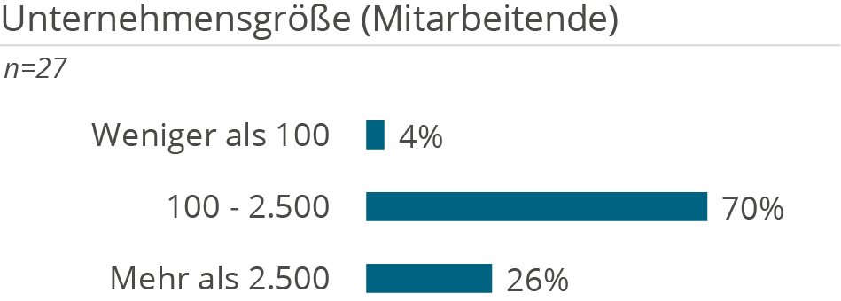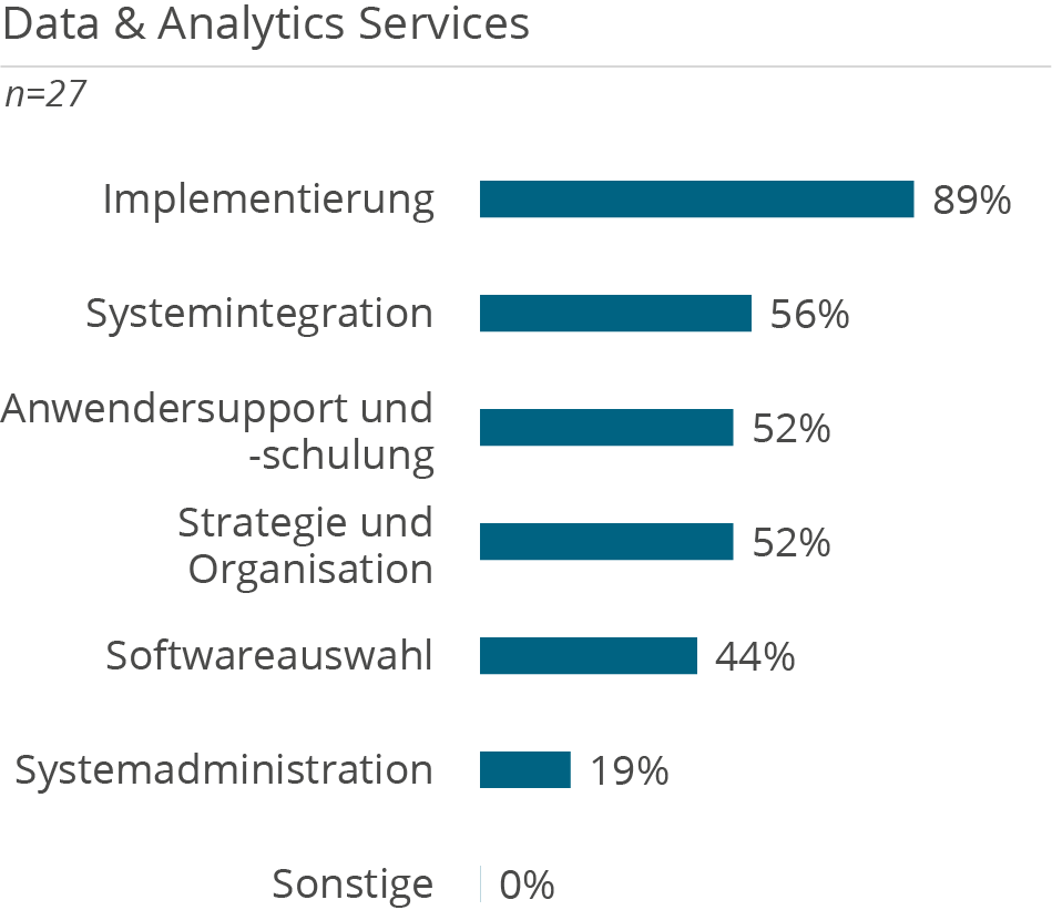 Die folgenden Demografie-Grafiken zeigen neben Kundendemografie (Unternehmensgröße und Branche), die Unterstützung der Kunden aufgeteilt nach Tätigkeiten in D&A Themenbereichen, erbrachten Services sowie eingesetzten Technologien.