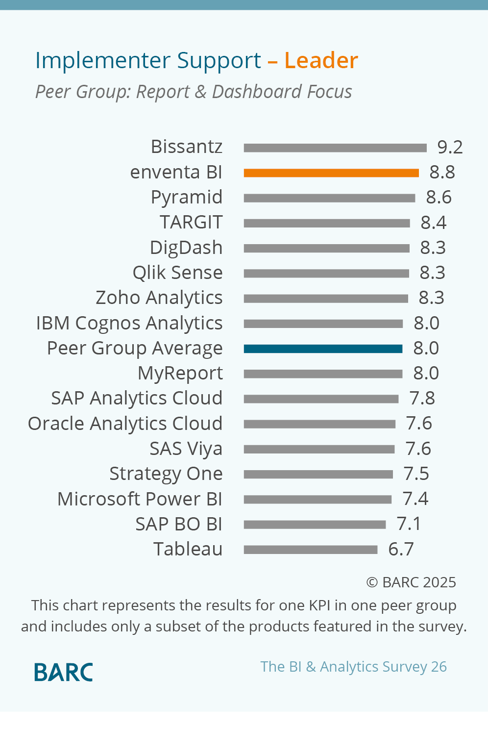 Kundenzufriedenheitsumfrage wurde enventa BI mit einem Net Promoter Score von 9,23 von 10 ausgezeichnet. Dies liegt hauptsächlich daran, dass unser Support- und Consulting-Team aus erfahrenen Beratungs- und Entwicklungsexperten besteht, die den Kunden schnell und direkt Lösungen für ihre Herausforderungen bieten können. Wir sind wirklich da, wenn Sie einmal Hilfe benötigen.