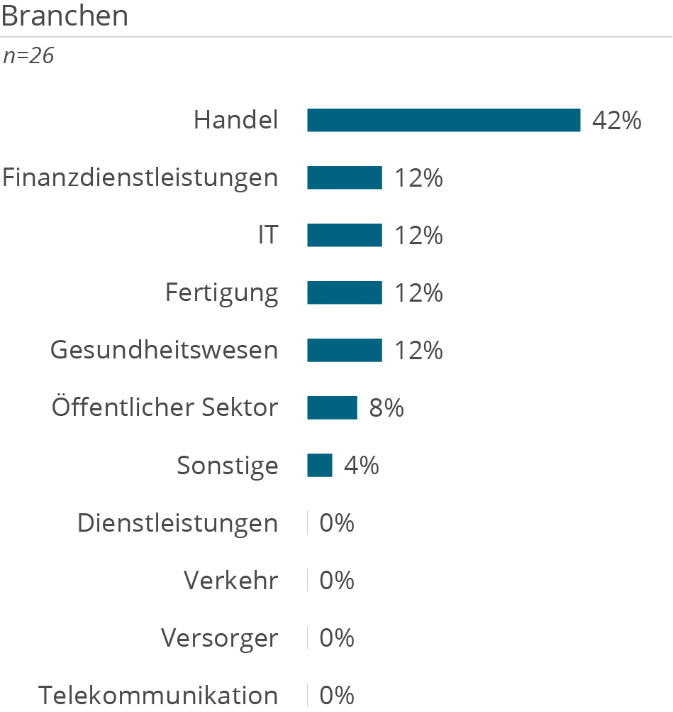 Die folgenden Demografie-Grafiken zeigen neben Kundendemografie (Unternehmensgröße und Branche), die Unterstützung der Kunden aufgeteilt nach Tätigkeiten in D&A Themenbereichen, erbrachten Services sowie eingesetzten Technologien.