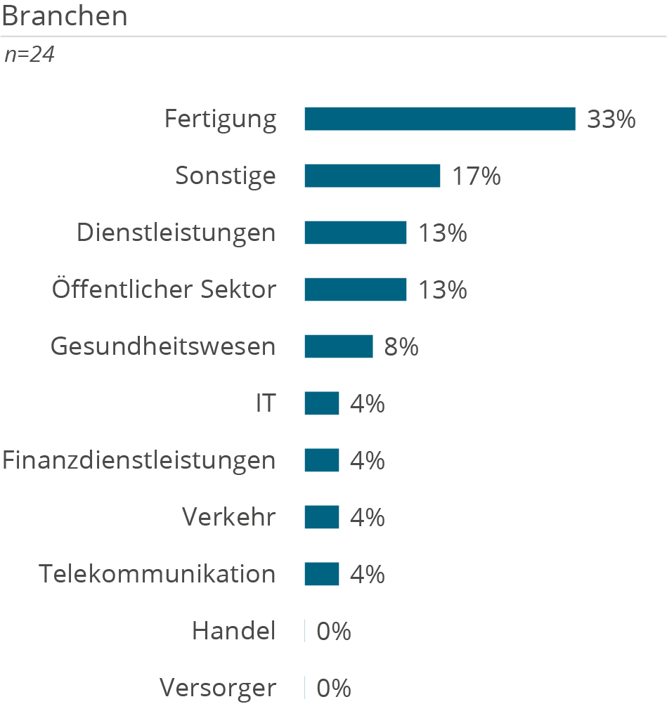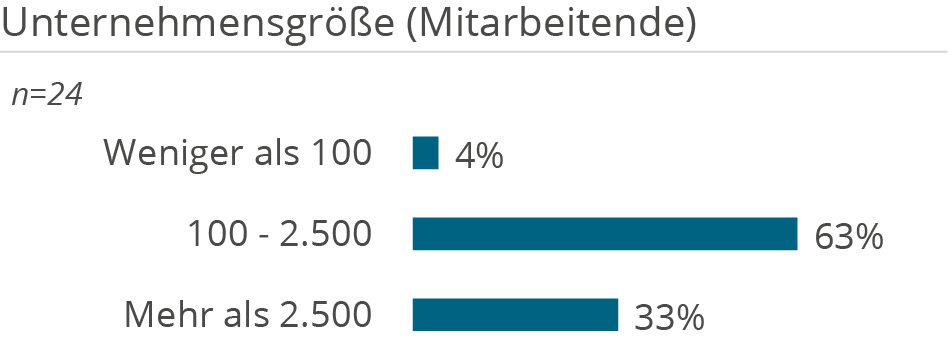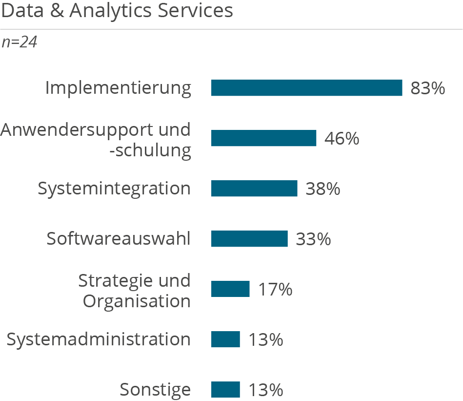 Die folgenden Demografie-Grafiken zeigen neben Kundendemografie (Unternehmensgröße und Branche), die Unterstützung der Kunden aufgeteilt nach Tätigkeiten in D&A Themenbereichen, erbrachten Services sowie eingesetzten Technologien.