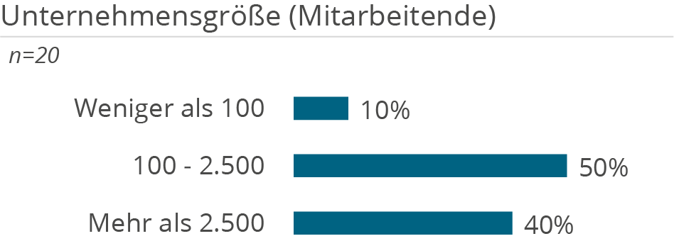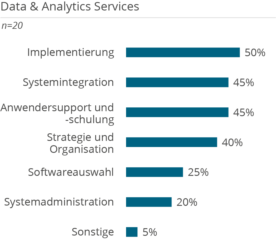 Die folgenden Demografie-Grafiken zeigen neben Kundendemografie (Unternehmensgröße und Branche), die Unterstützung der Kunden aufgeteilt nach Tätigkeiten in D&A Themenbereichen, erbrachten Services sowie eingesetzten Technologien.