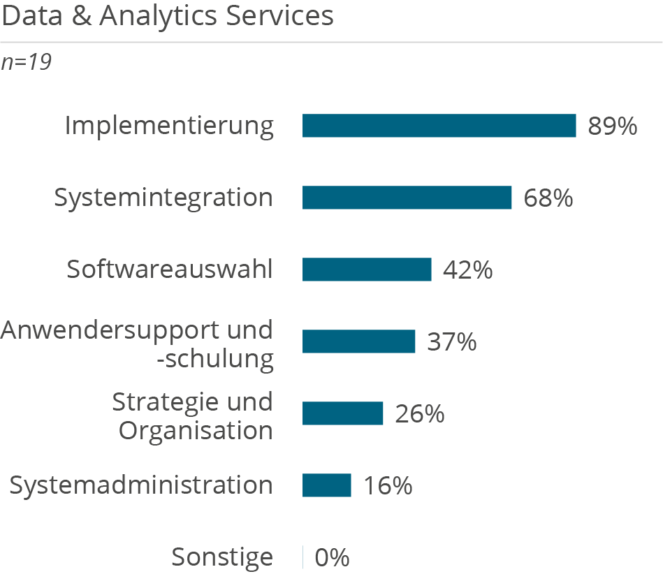 Die folgenden Demografie-Grafiken zeigen neben Kundendemografie (Unternehmensgröße und Branche), die Unterstützung der Kunden aufgeteilt nach Tätigkeiten in D&A Themenbereichen, erbrachten Services sowie eingesetzten Technologien.