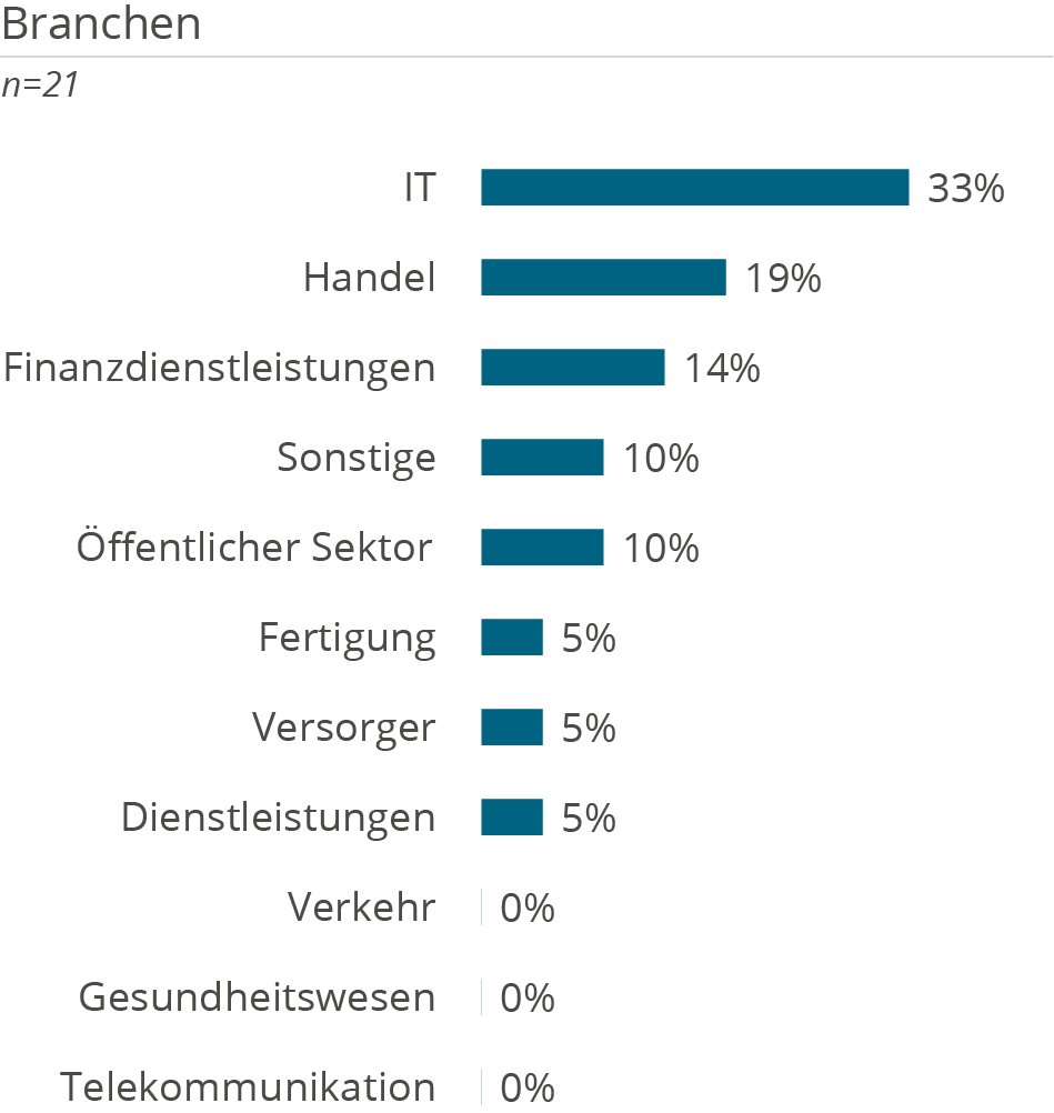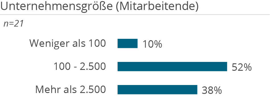 Die folgenden Demografie-Grafiken zeigen neben Kundendemografie (Unternehmensgröße und Branche), die Unterstützung der Kunden aufgeteilt nach Tätigkeiten in D&A Themenbereichen, erbrachten Services sowie eingesetzten Technologien.