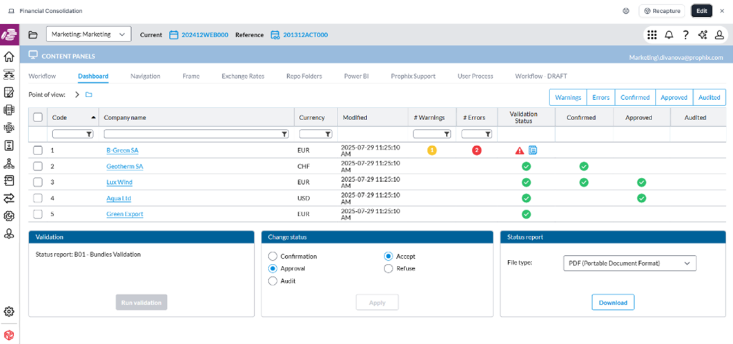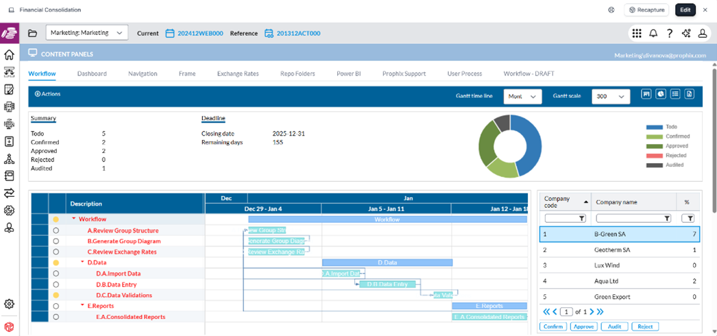 Für Finanzkonsolidierung und Abschluss bietet Prophix One Funktionen für die gesetzliche Konsolidierung und die Managementkonsolidierung, einschließlich Funktionen für Standard- und komplexere Anwendungsfälle. Darüber hinaus sind vordefinierte Vorlagen für Bilanz-, Gewinn- und Verlust- sowie Cashflow-Berichte verfügbar. Die Anwender können das Format und Layout von Finanzberichten ändern, ohne dass sie programmieren oder sich mit der Erstellung komplexer Berichte auskennen müssen.