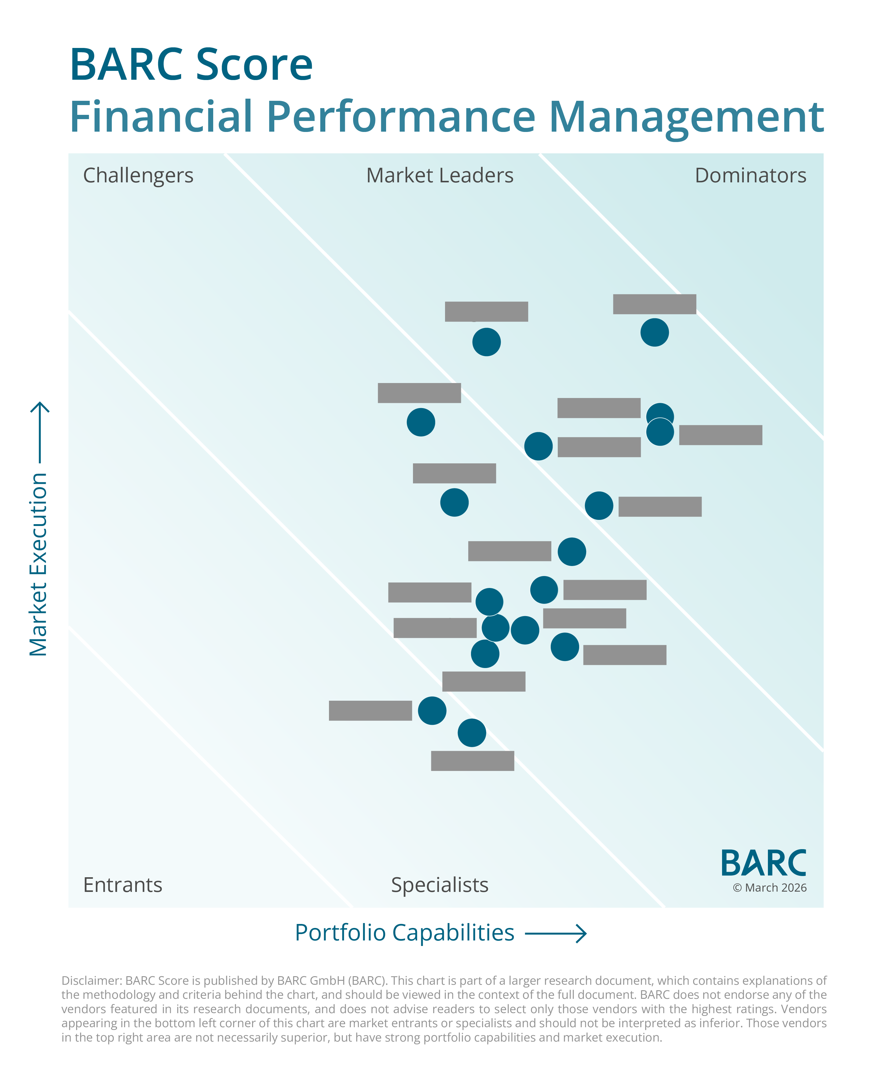 This BARC Score examines the market for FPM products and portfolios. Based on countless data points from various BARC surveys and many analyst interactions, vendors are rated on a variety of criteria, from portfolio capabilities and architecture to sales and marketing strategy, financial performance, and customer feedback.