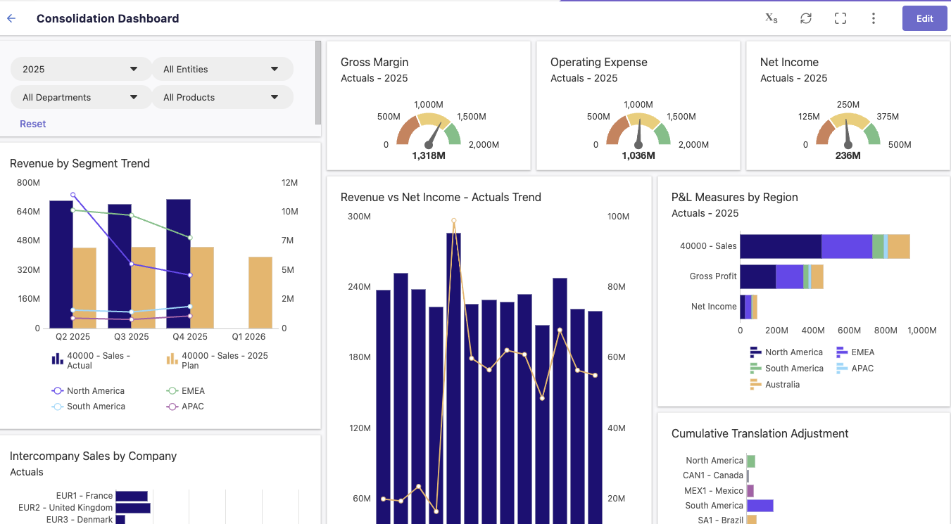 - Cloud-based platform for business users with integrated functionality for financial consolidation and close, planning, budgeting and forecasting, reporting, analysis and dashboarding, and marketing performance management.