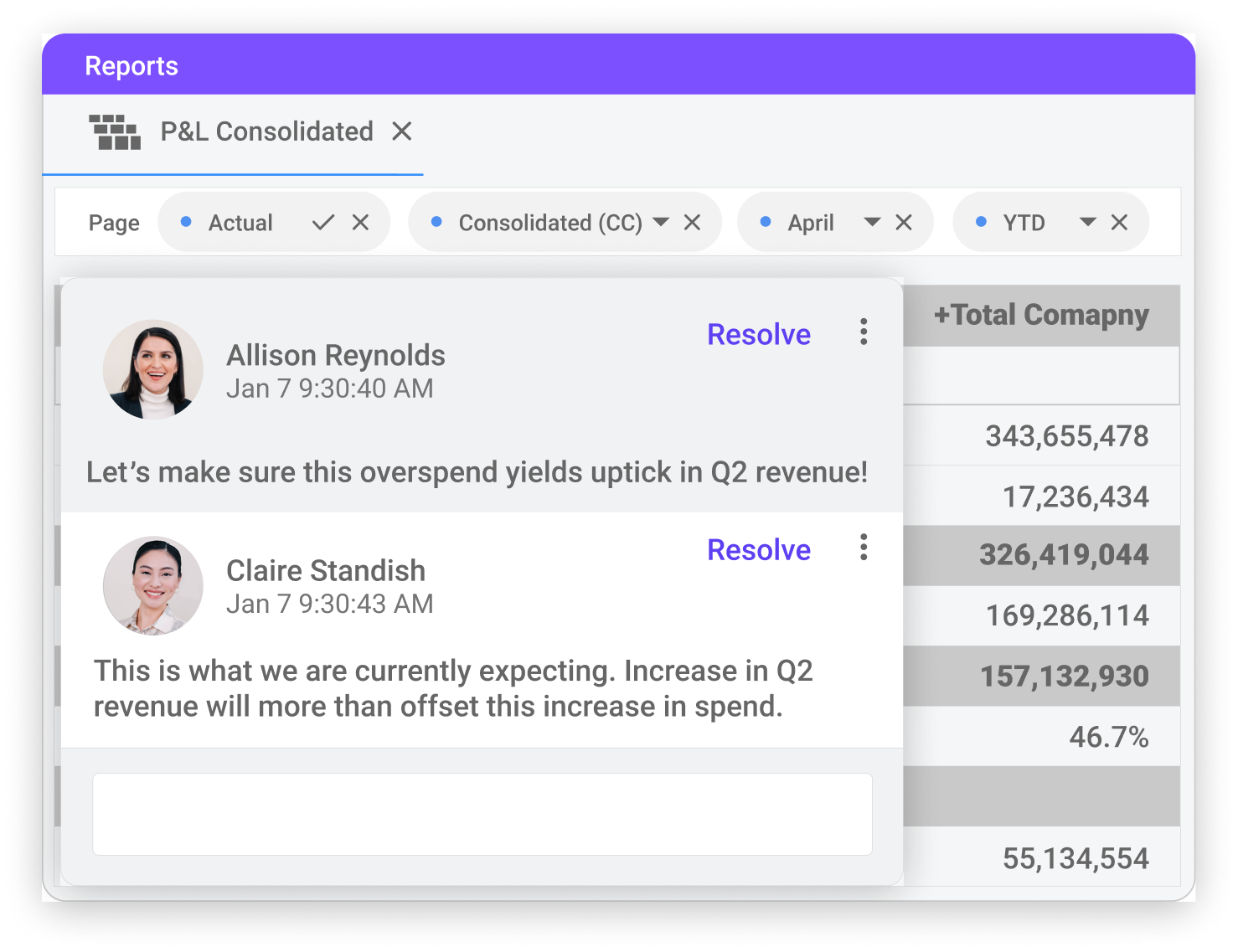 - Comprehensive workflow functionality for flexible control of tasks and planning, budgeting and forecasting processes. In addition, collaboration capabilities support conversations and decision-making processes through comments, threaded conversations, chats and more.