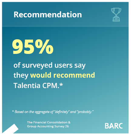 - Talentia CPM received strong customer feedback in this year’s Financial Consolidation & Group Accounting Survey. As well as strong results in the Recommendation and Implementer Support KPIs, customers were happy with their project success.